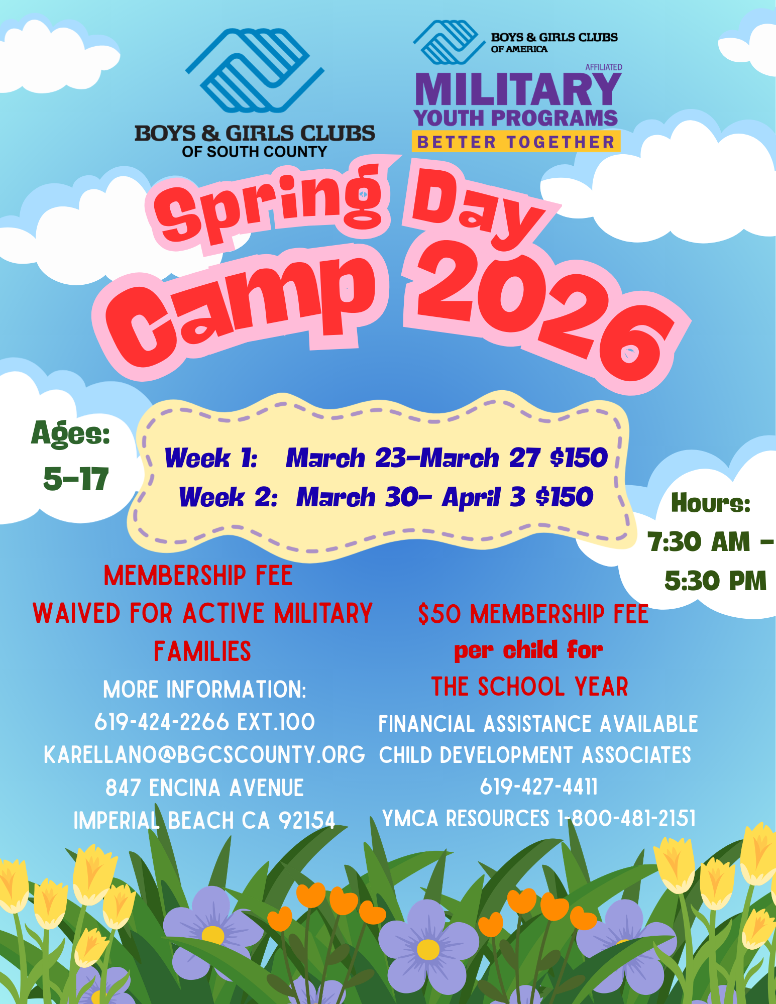 - Financial Assistance Available: Child Development Associates (CDA) (Español) or (English)(619-427-4411 EXT. 1400) and/or YMCA Resources (1-800-481-2151).